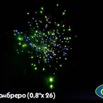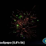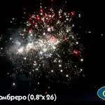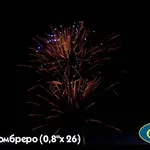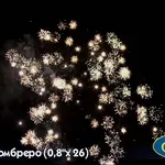 Описание: Оправляемся в жаркую и страстную Испанию! Сожженные солнцем огненно-рыжие тонкие поля латиноамериканского сомбреро украшены красивыми синими звездами. А вот и вечернее представление зажигательных испанских танцев, исполненное восхитительными, полыхающими сферами синих, зеленых и мерцающих рыжих огней, которые впоследствии разрываются острыми искрами. Для поддержки праздничного настроения присоединились к всеобщему веселью и пушистые золотые змейки, которые не стали долго ждать, и рассыпали множество трещащих веселых искр. Их шалости прекращает появление главного героя салюта - тонкие строгие поля сомбреро из рыжих комет, украшенных сиреневыми и зелеными огнями. Финал - праздничный зажигательный танец искр, веселых огней и золотых щедрых россыпей. Почувствуйте страстный темперамент Испании с этим великолепным, зажигательным салютом! Эффекты: 1. Множество золотых ниспадающих нитей (парча) и синие звезды. 2. Зелено-синяя сфера (пион) и золотое мерцание. 3. Веер W-формы: По бокам - вертушки, в центре - облако трещащих разрывов (трещащая хризантема). 4. Множество золотых ниспадающих нитей (парча) и зелено-фиолетовая сфера (пион). 5. Свистящая комета (змейка) разрывается красно-белой мерцающей сферой (пион) и облаком трещащих разрывов (трещащая хризантема).
